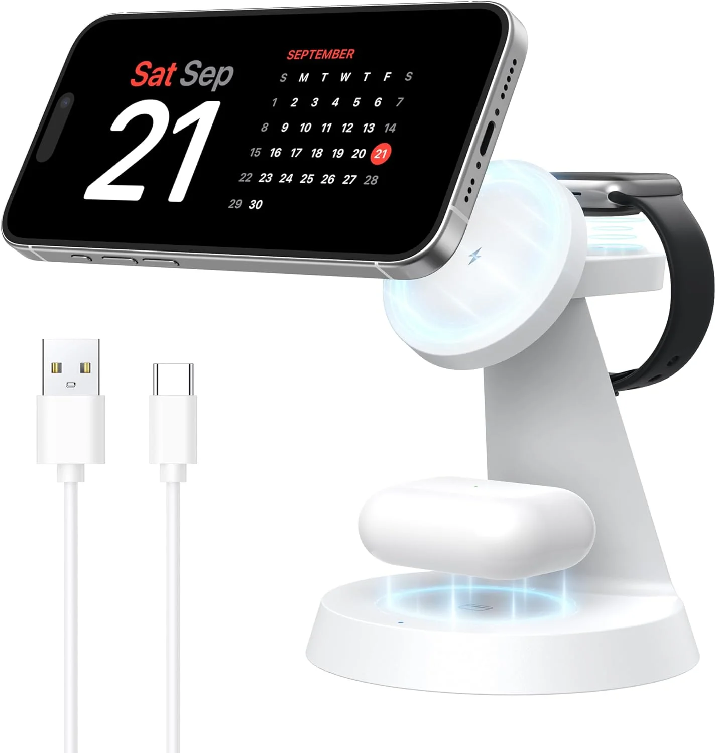 Isso porque combina carregador de relógio, carregador de telefone e carregador de fone de ouvido em um carregador. Assim, temos apenas 1 cabo e adaptador QC3.0 doeboe estação de carregamento sem fio podem carregar seu iPhone, AirPods 2, 3 e pro e atuar simultaneamente como um suporte de fone de ouvido, relógio e celular.