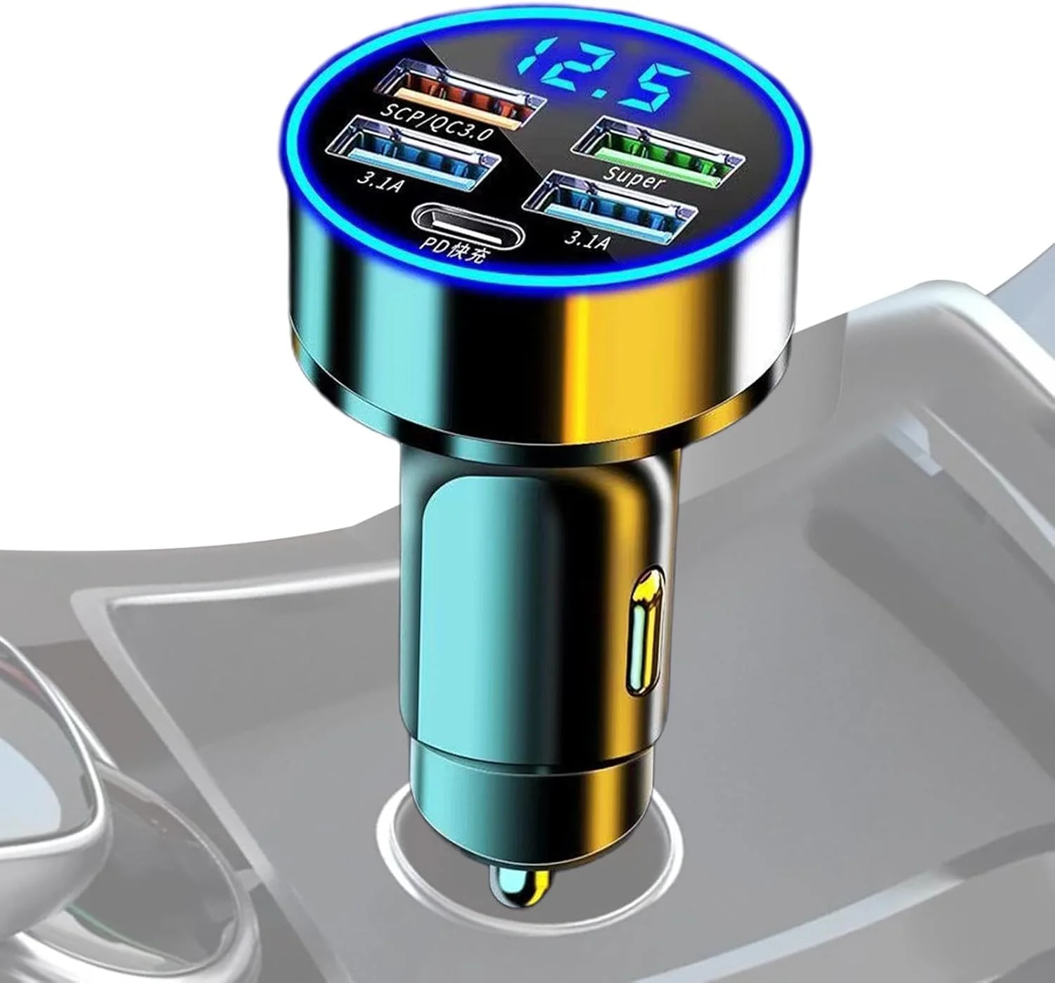 Mantendo alta eficiência até quando carrega vários dispositivos simultaneamente. Temos uma tecnologia avançada, assim, este carregador veicular oferece cinco portas de carregamento, incluindo USB-A e USB-C, permitindo carregar vários dispositivos. Perfeito para qualquer dispositivo eletrônico, seja você um celular, câmera ou notebook.