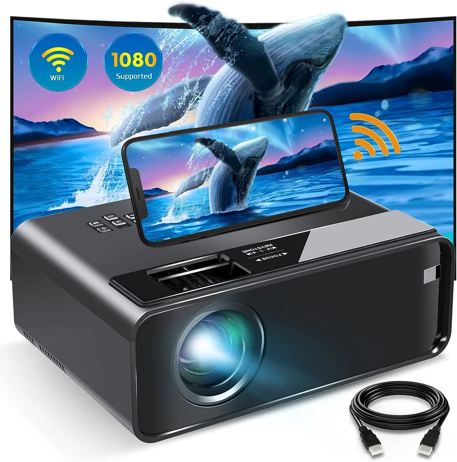 Este projetor para celular é indicado para quem quer o melhor que há no mercado sem ser limitado pelos fios ou pelo uso de adaptador. Desse modo, é projetado com a conexão Wi-Fi mais recente, compatível com Android, iPhone e Windows 10. Além disso, você pode conectar o projetor ao seu iPhone com uma linha de cabo original facilmente.