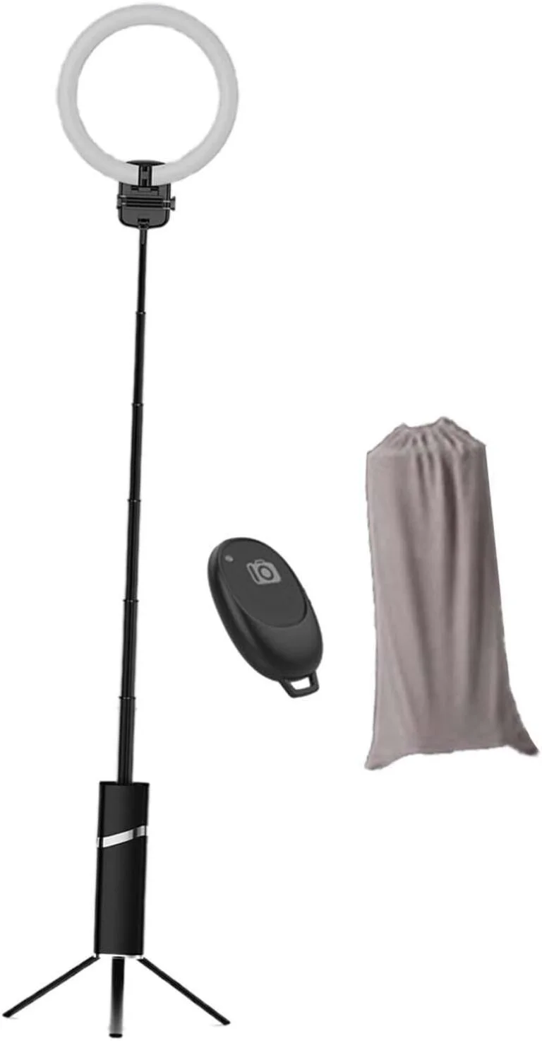 Com suporte de tripé extensível, pode se estender até 193 cm/75,98 polegadas, garantindo sua estabilidade. Além disso, este ring light é compacto e portátil, tamanho dobrável 27 cm x 10 cm x 7,5 cm. Ele vem com uma bolsa de armazenamento para fácil embalagem. Temos também um tripé dobrável que torna-o leve e fácil de transportar.