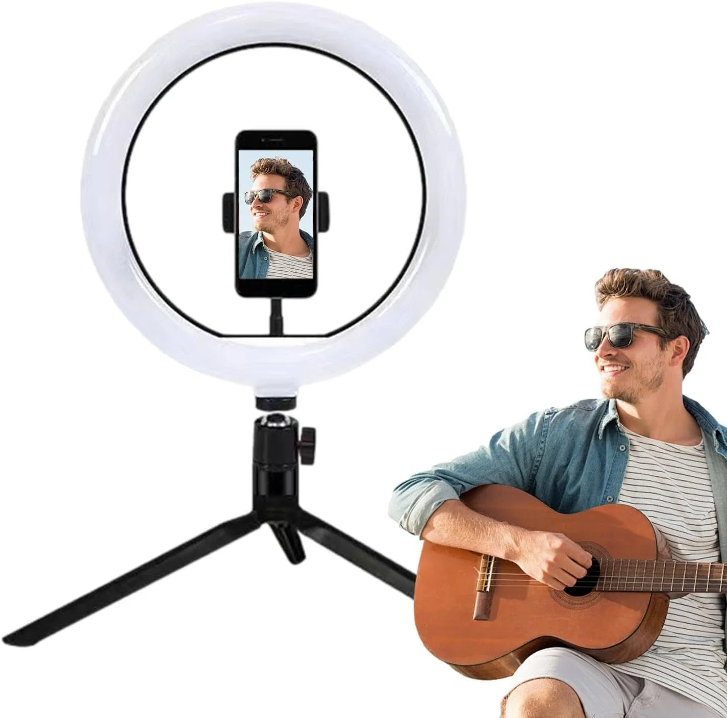 O suporte removível é projetado para ser leve e flexível para facilitar a desmontagem, pode ser dobrado como um tripé de mesa ou desdobrado para ficar no chão facilmente. Adicione iluminação natural, brilhante e ajustável em cores para maquiagem, transmissão ao vivo, selfie, fotografia e videoconferência.