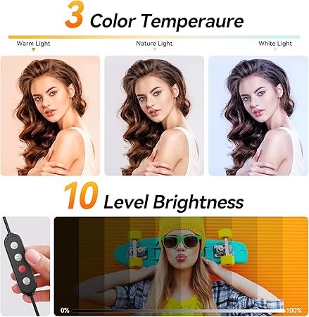 Seus brilhos poderosos podem realçar sua beleza e criar vídeos impressionantes para TikTokers, vloggers e entusiastas de selfies. Por fim, se você precisa para uso profissional ou selfie pessoal, este anel de luz permite que você controle suas configurações de iluminação com facilidade. Você pode escolher entre três modos de temperatura de cor e ajustar o nível de brilho de acordo com sua preferência.