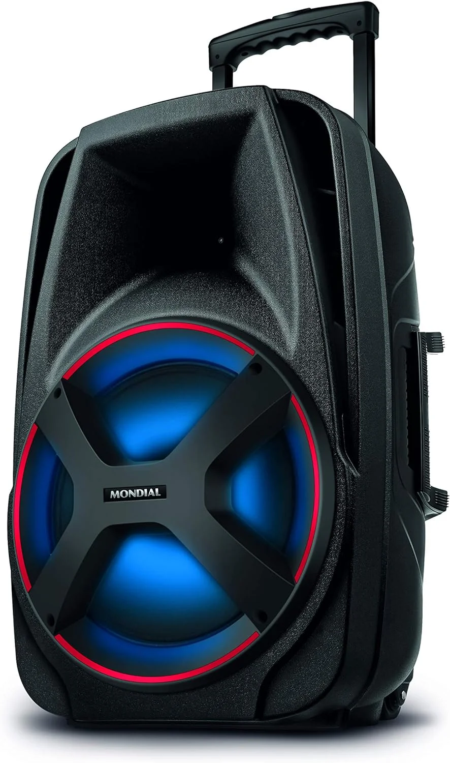 Esse modelo também é da Mondial. Da mesma forma que o anterior, ele também possui um design robusto, mas oferece os recursos necessários para facilitar o transporte do dispositivo, como rodinhas na traseira e alça na parte superior. Possui uma potência elevada de 550 W e conta com um sistema de luzes LED em sua estrutura. Seu principal benefício está no custo mais baixo quando comparado com outras caixas de som Bluetooth.