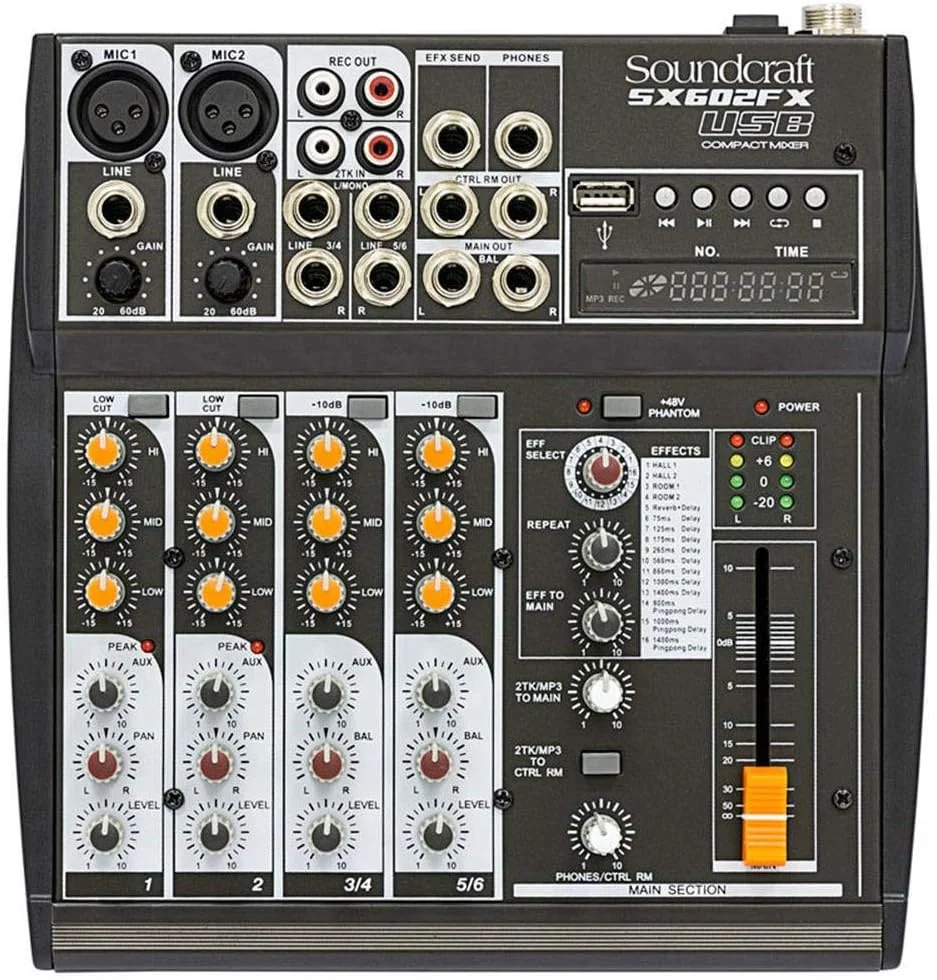 A mesa de som Soundcraft USB SX602FX é indicada para músicos, produtores e pequenos estúdios que buscam um equipamento compacto e eficiente para apresentações ao vivo ou gravações caseiras com uma extrema qualidade, acima de tudo. Com 6 canais, sendo 2 entradas de microfone balanceadas XLR e entradas de linha P10, ela permite conectar microfones, instrumentos e outros dispositivos de áudio com qualidade e controle precisos nos mais diversos sentidos. Seu design funcional e intuitivo facilita ajustes rápidos, tornando-a ideal para quem deseja praticidade sem abrir mão da performance sonora de alta qualidade nos mínimos detalhes sonoros.